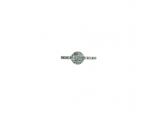 Годежен пръстен с 'клевер' монтаж. Множество багети и брилянти монтирани, така че да изглеждат като един голям камък