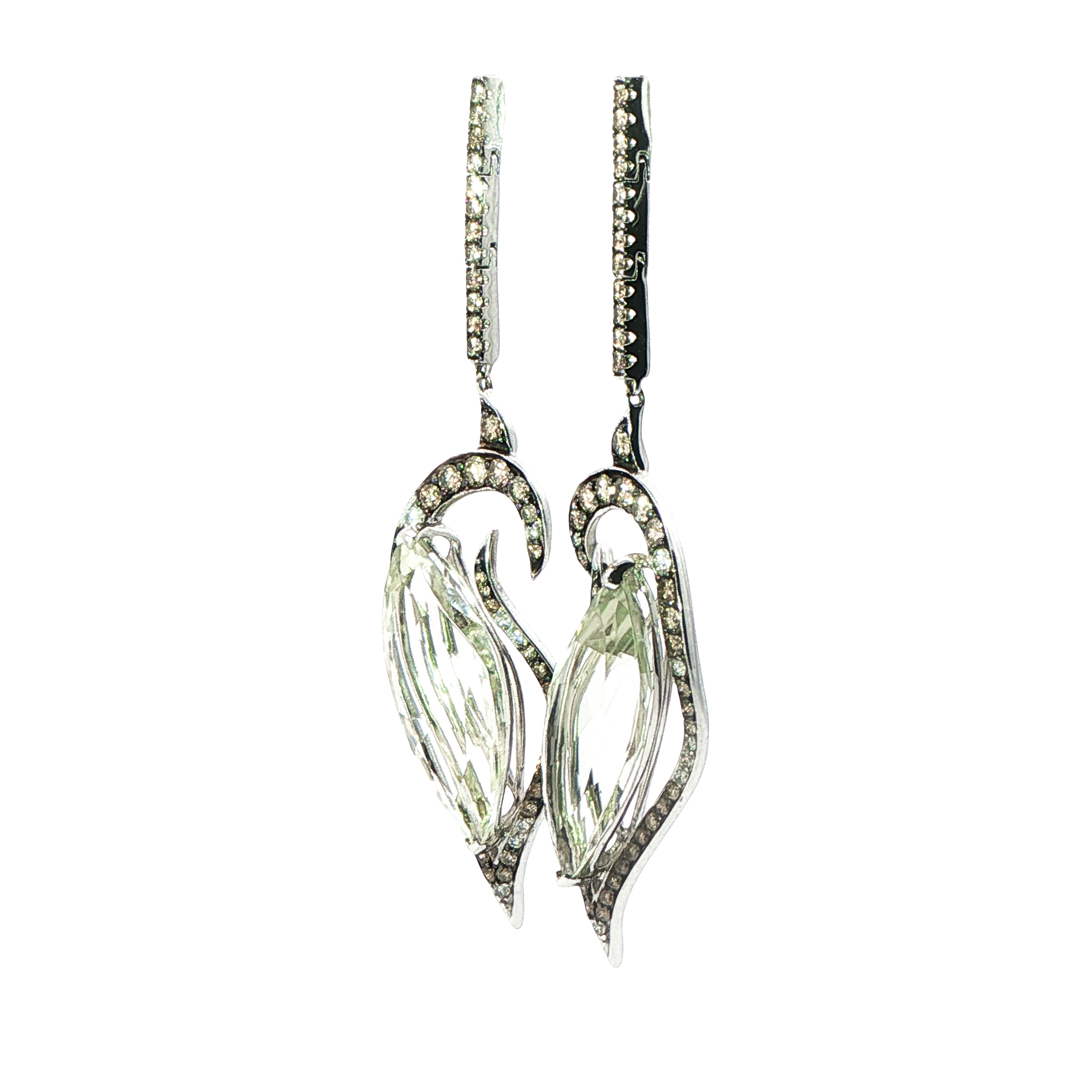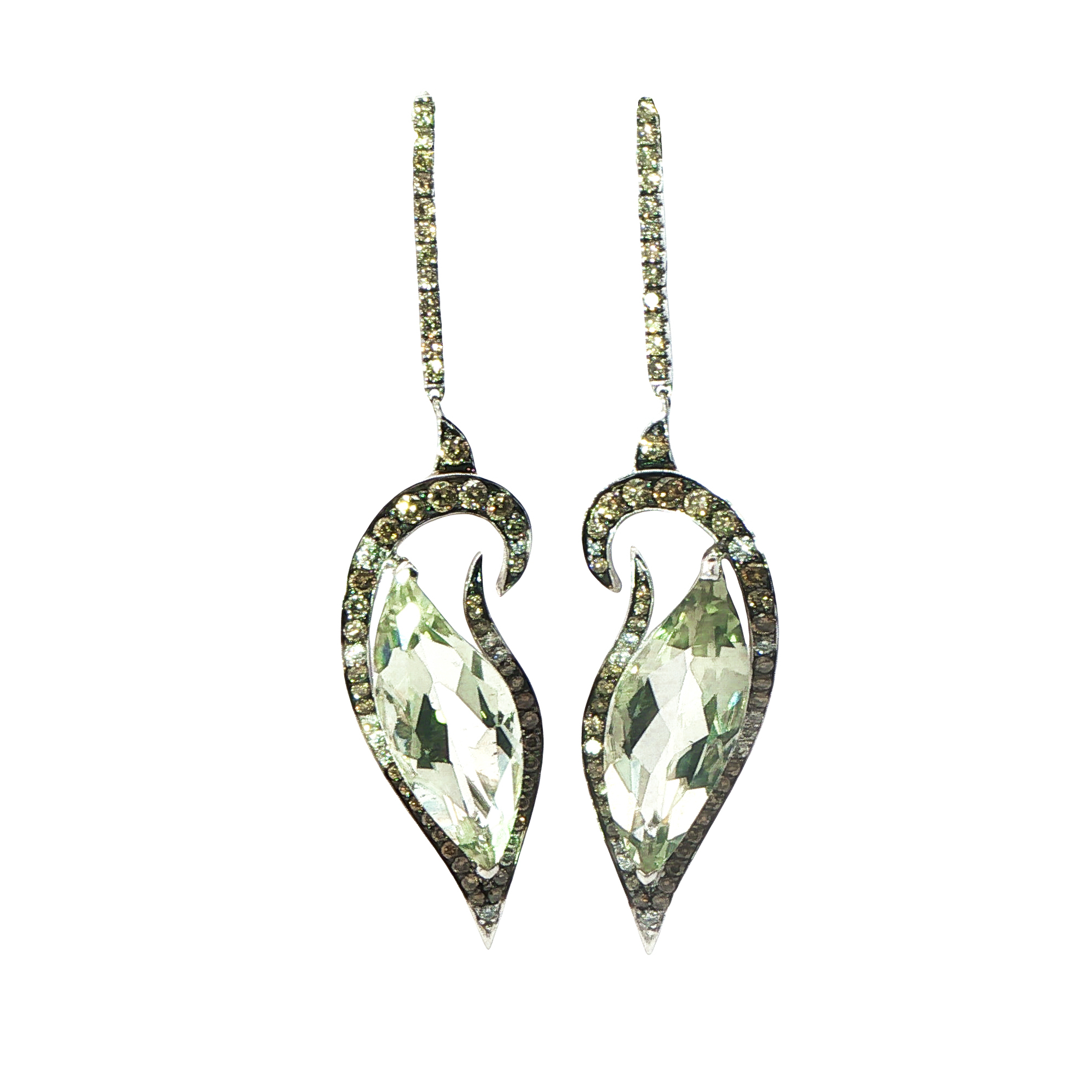 Висящи обеци с празеолити и кафяви диаманти