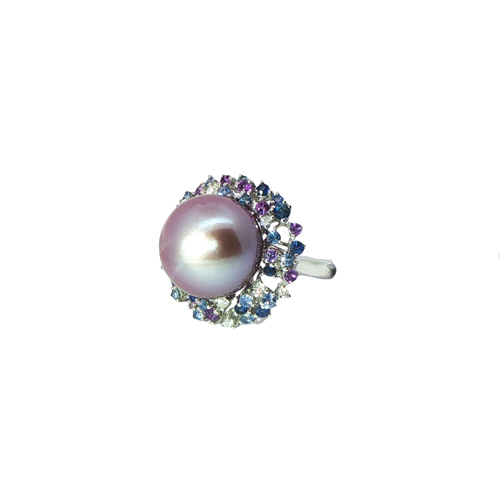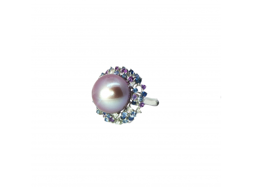 Пръстен с лилава перла, сини сапфири, аметисти и диаманти