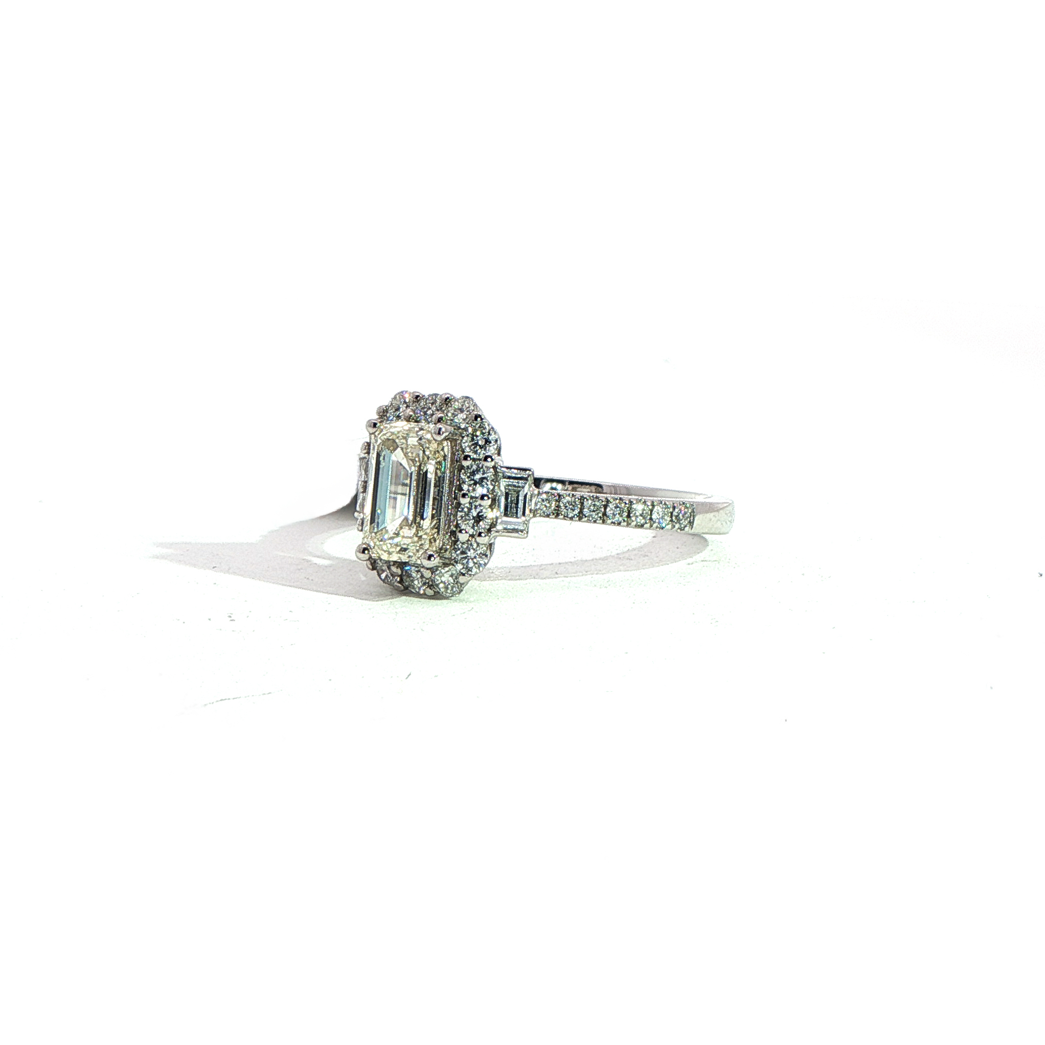 Класически годежен пръстен централен диамант Emerald cut и антораж от брилианти и багети.