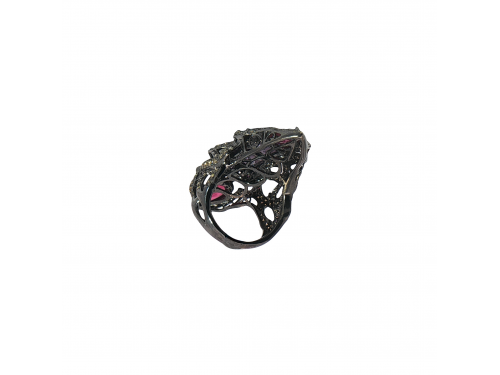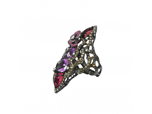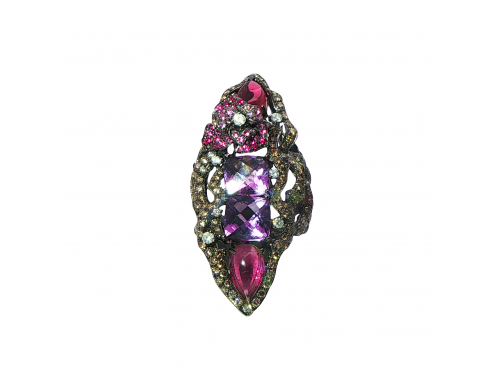 Пръстен с преплетен дизаин, аметисти, рубелити, и бели и кафяви диаманти